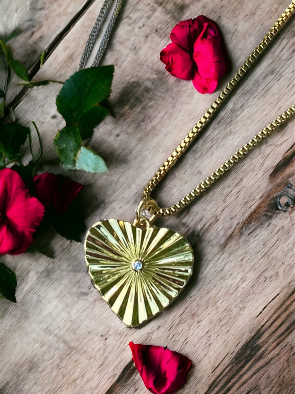 This elegant Art Deco heart pendant necklace features a gold pendant with a CZ accent in the center. The 18 inch gold filled chain adds a touch of sophistication to any outfit. Pendant measures 3/4 inch in diameter, making it the perfect size for everyday wear. Elevate your style with this timeless piece.