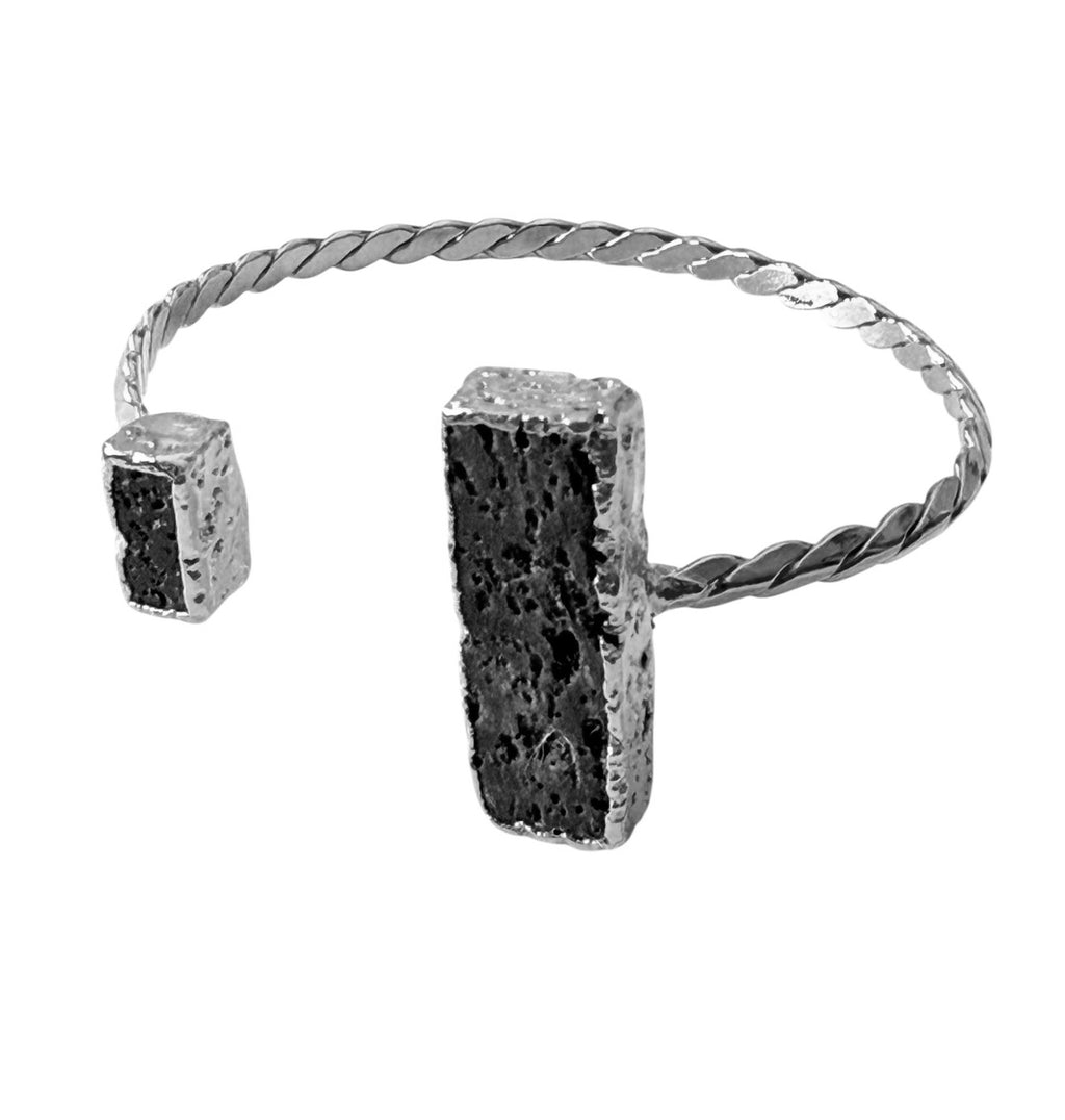 Go with grace, but stay grounded: The Drift bracelet boldly redefines refined edge with its asymmetrical design featuring two striking lava stones—one measuring 1 inch, the other a daring ½ inch. Its open cuff is crafted from intertwined braided wire, offering both a rugged texture and adjustable fit. This piece commands attention and channels raw energy, perfect for those who embrace fearless style with a natural twist.