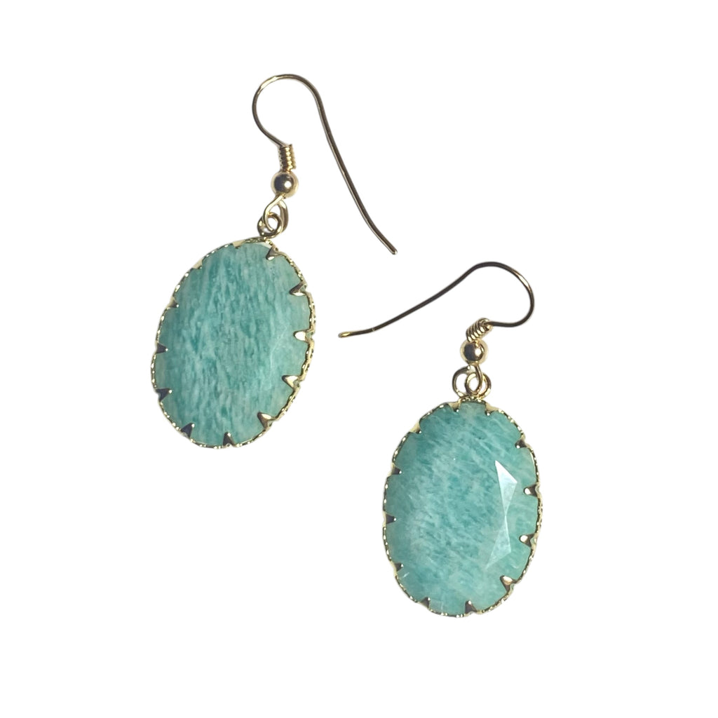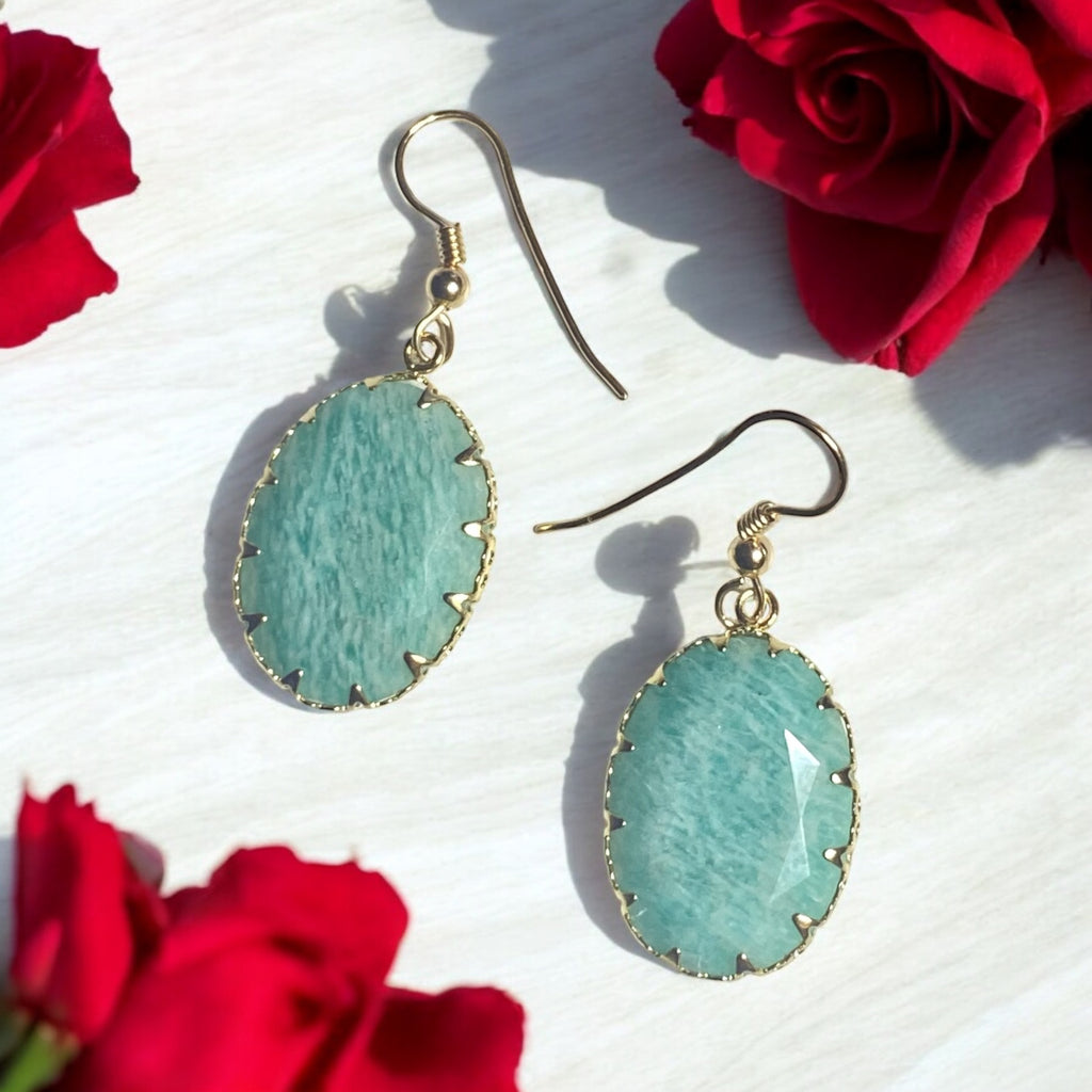 Explore your inner beauty with Britt! These one-inch, gold-filled earrings feature stunning Amazonite oval stones that were even featured on the finale of the bachelorette. Add a touch of elegance to any outfit and show off your unique sense of style.