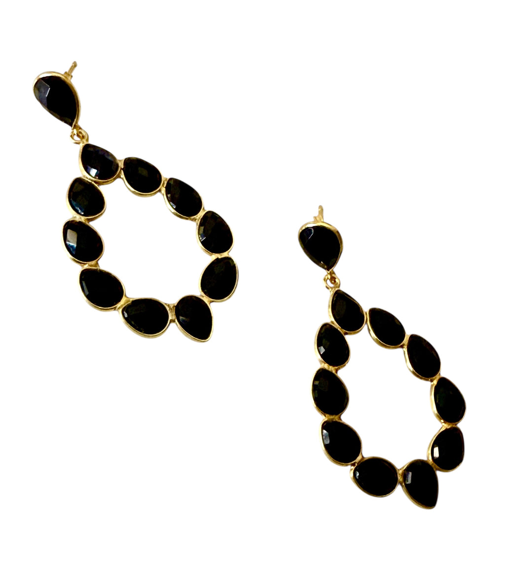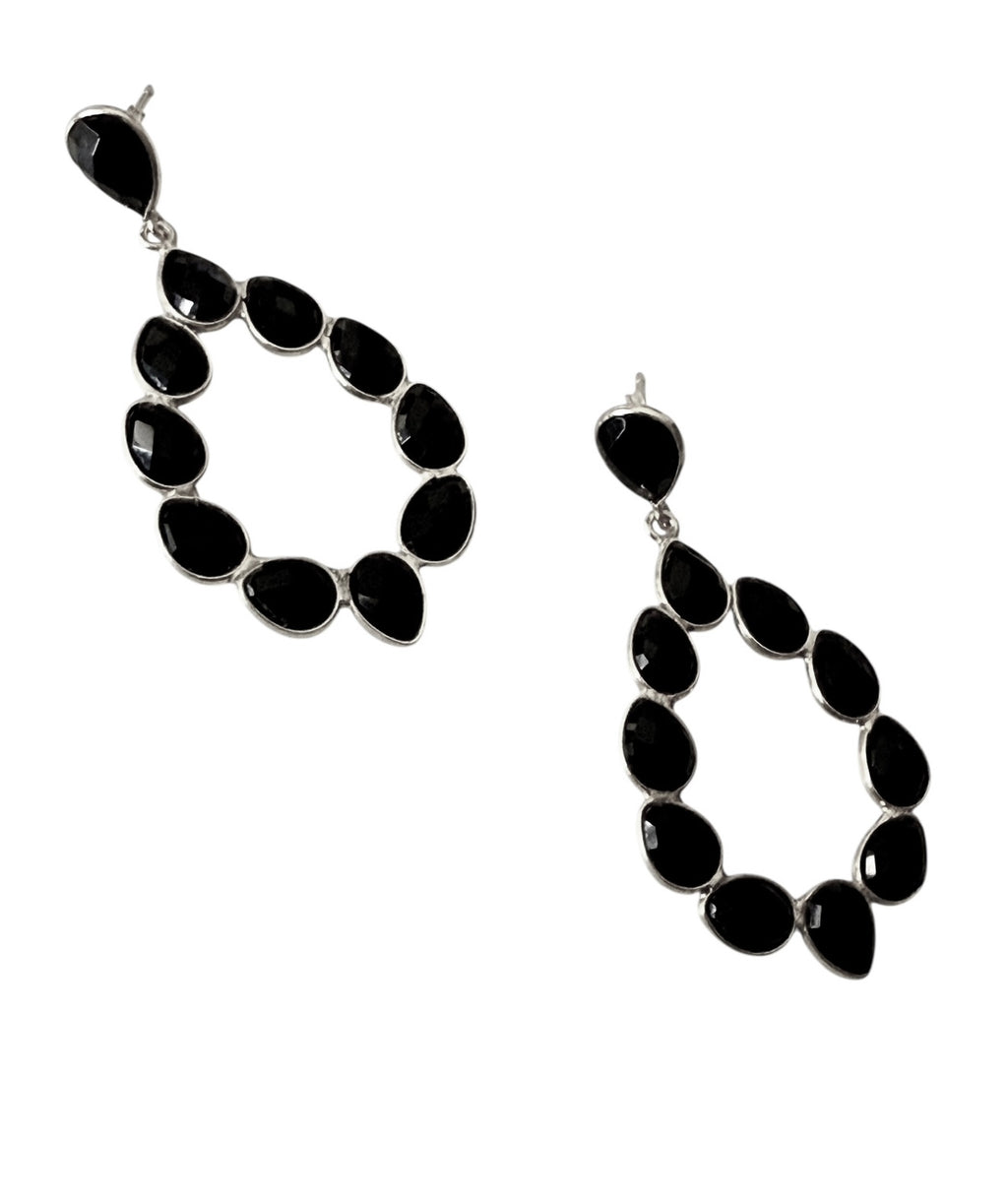 A soft reminder of your own voice: Echo earrings fuse bold design with dark allure—2-inch teardrop hoops encrusted with shimmering onyx stones. These captivating studs demand attention, adding an edgy, fearless touch to your style. Perfect for those who dare to stand out.