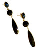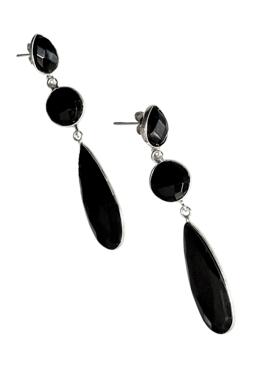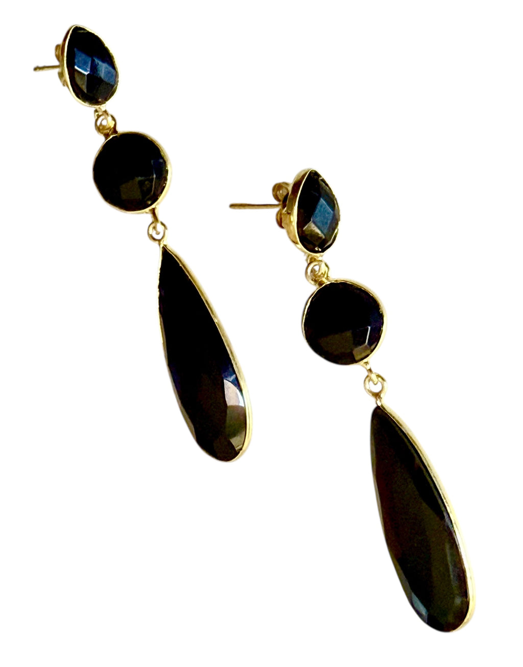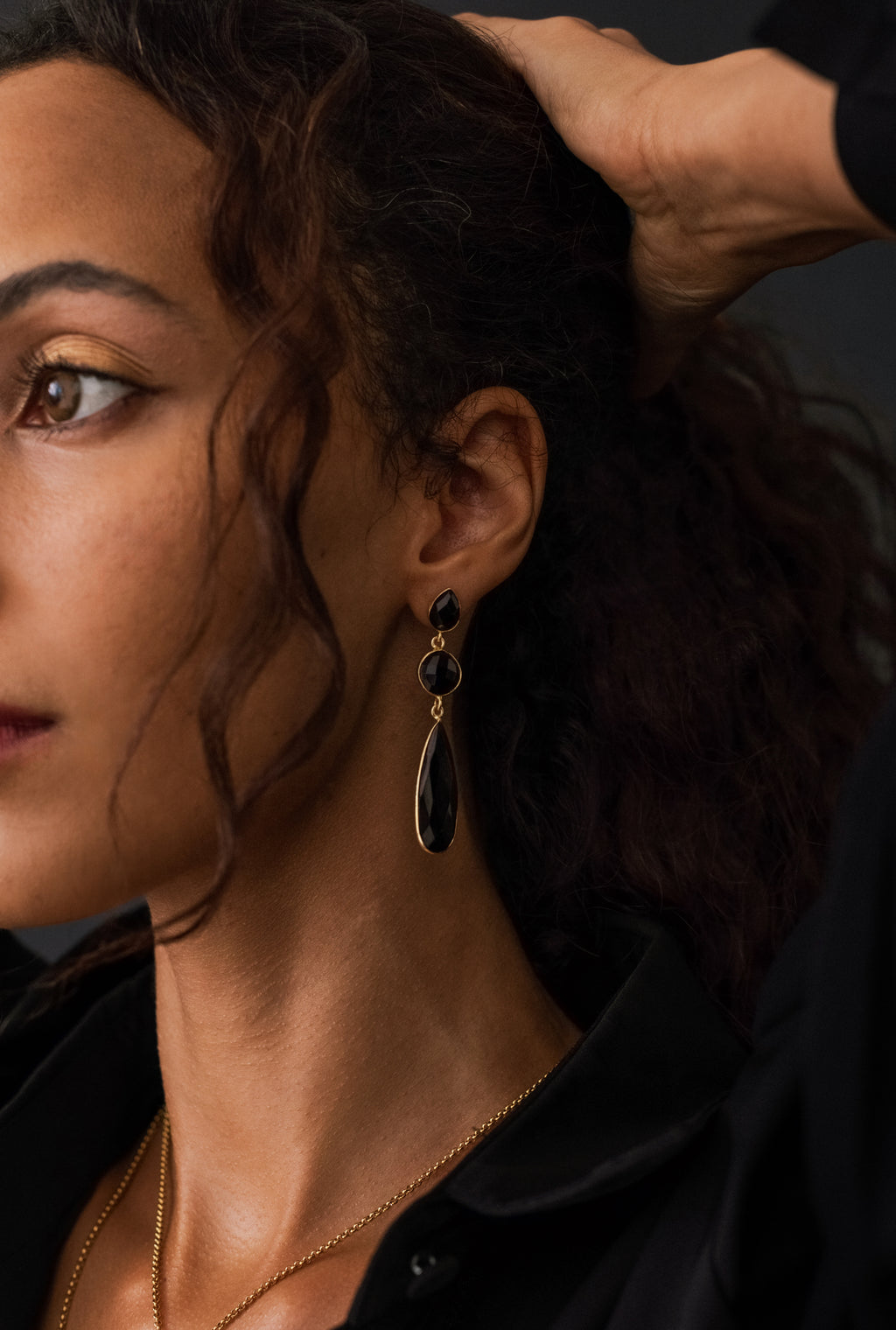 Ancient magic at your fingertips: The Grimoire earrings showcase three dramatic onyx stones in teardrop, round, and elongated teardrop shapes. Stretching 2.25 inches long, these daring studs command attention with their striking silhouette and deep black sheen—perfect for bold, fearless style.