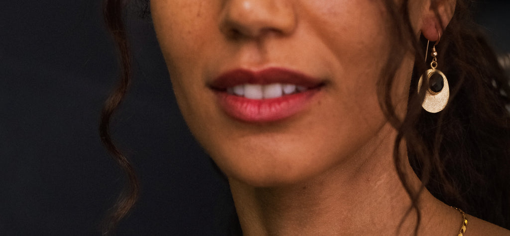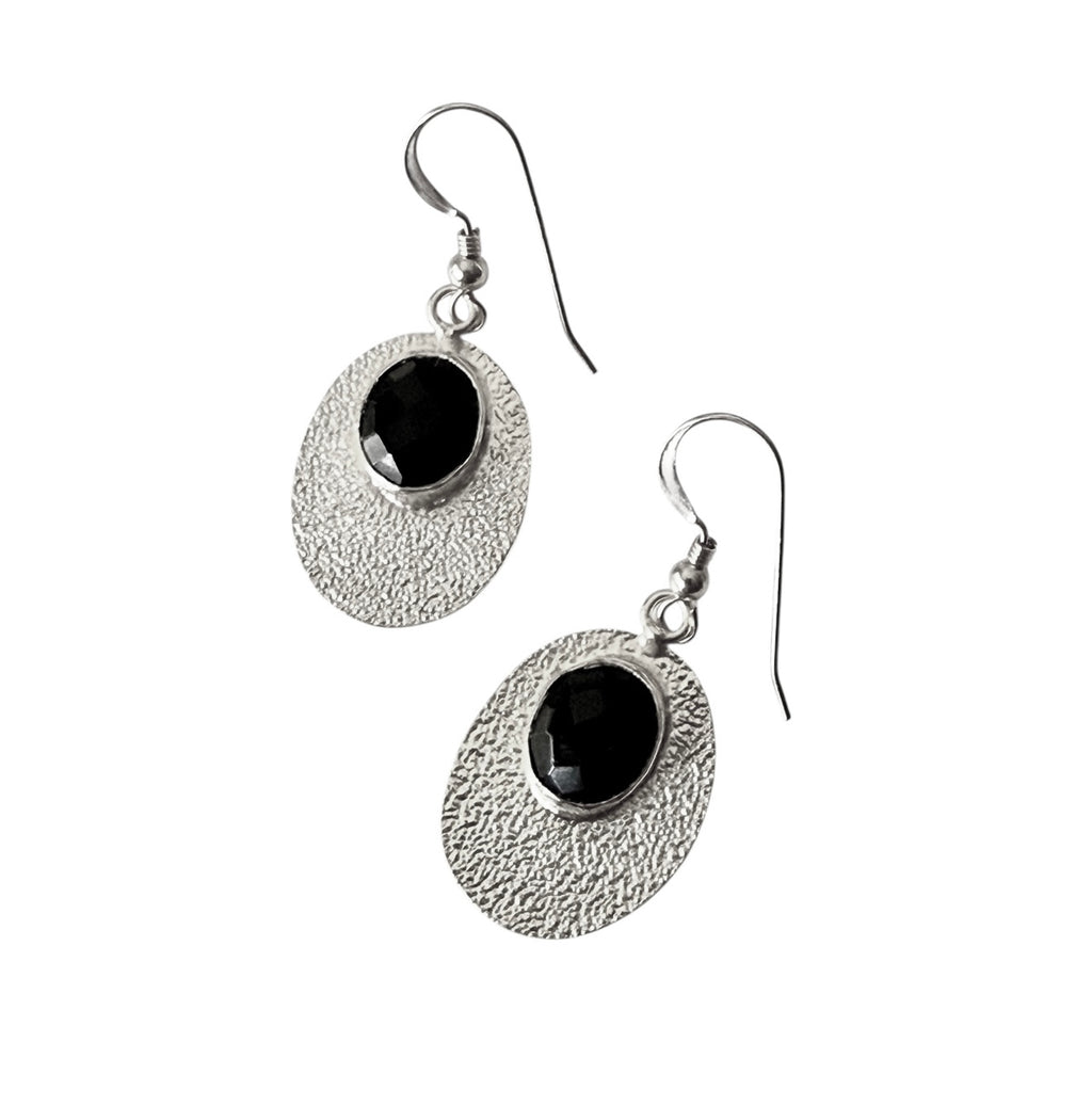 Command attention with the Midnight Bloom earrings. These 1-inch hammered oval coin plates showcase bold oval onyx stones, merging rugged texture with intense black elegance for a fiercely daring accessory that transforms any outfit.