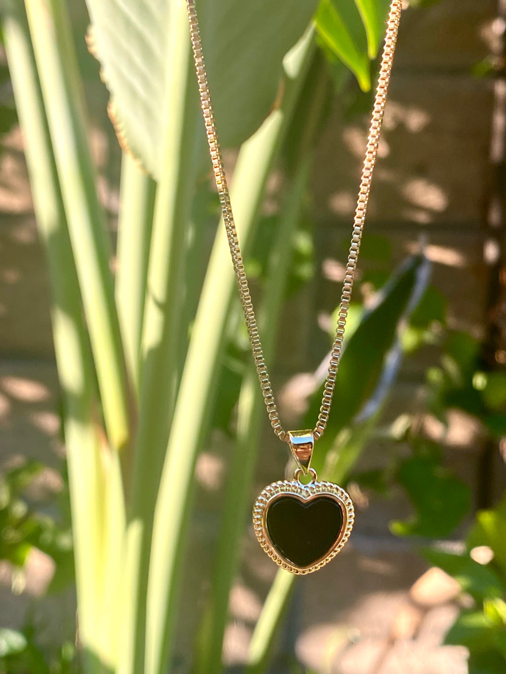 Discover an elegant addition to your jewelry collection with our Medium Black Heart Necklace. The stunning black enamel heart pendant, paired with an 18 inch gold filled chain, exudes sophistication and style. Its perfect size and delicate design make it versatile for any occasion.