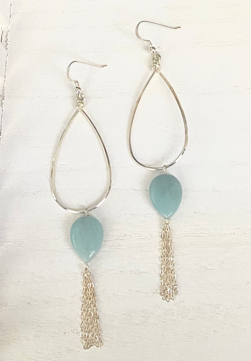 Elevate your look with these stunning Amazonite hoop tassel earrings. Crafted with a stunning Amazonite tear drop suspended from a small sterling silver hoop, with a small chain tassel. The earrings measure 3 inches in length and are sure to be a standout addition to your wardrobe.