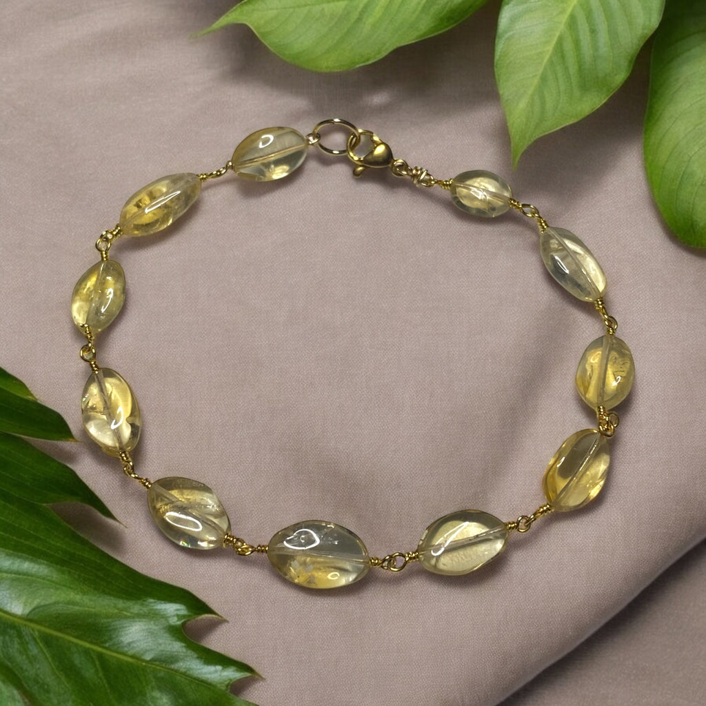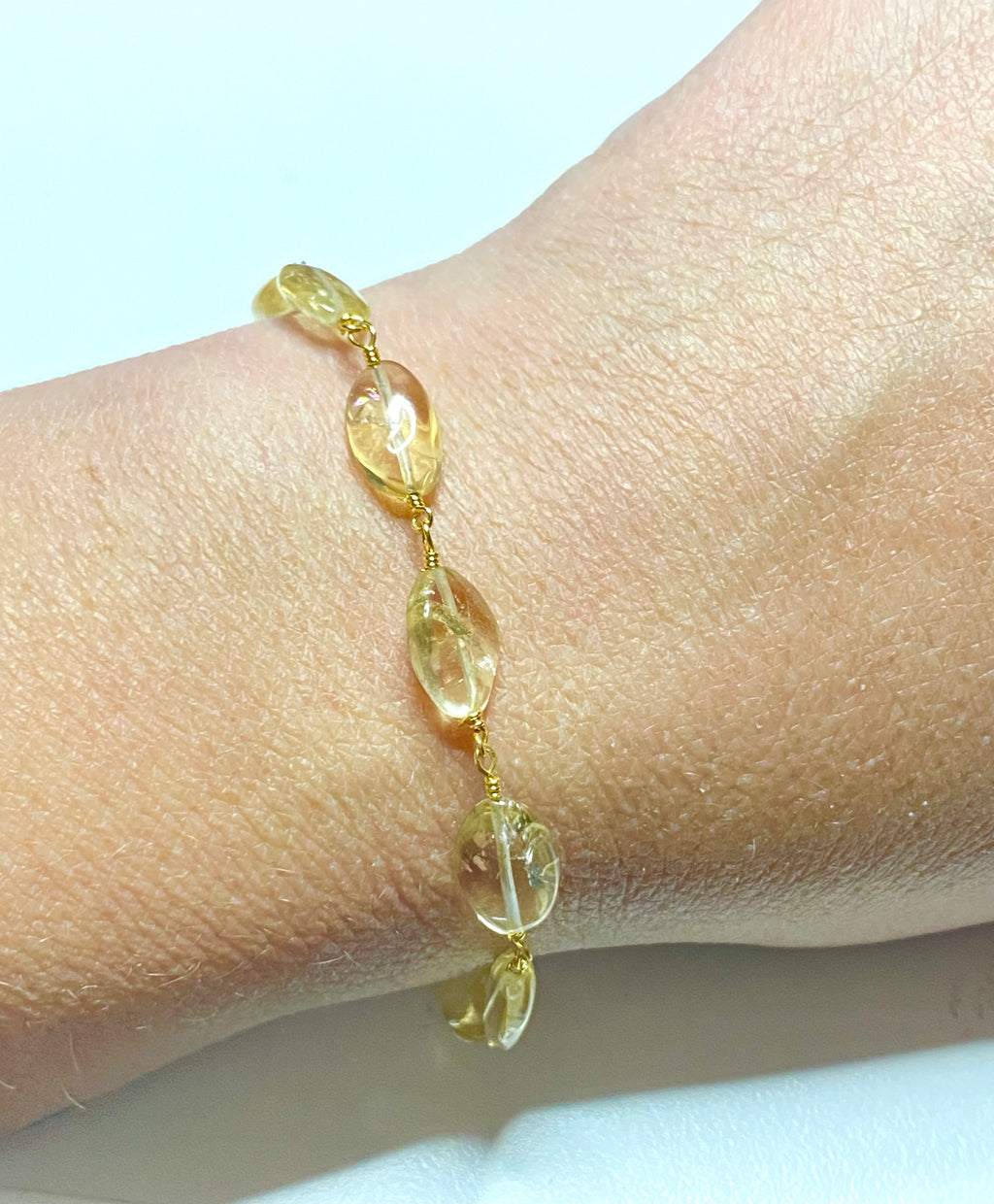 This elegant Citrine stone bracelet features a hand-beaded design and measures 7 inches in length. Perfect for adding a touch of sophistication to any outfit, the Citrine stones offer a warm and positive energy that is believed to promote success, prosperity, and clarity of the mind. Unlock your potential with this stunning bracelet.