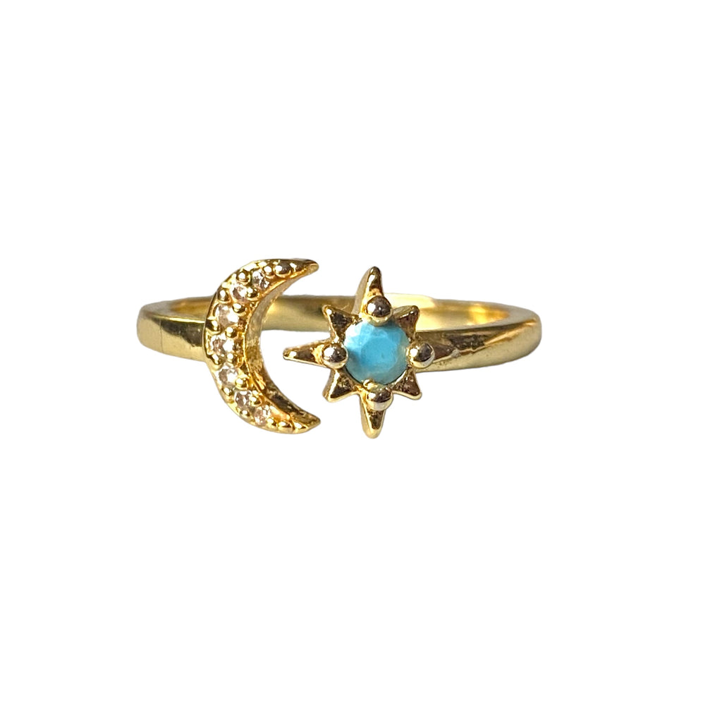 Experience the true magic of the night sky with our Casper ring! This delicate gold filled adjustable ring features a stunning cz studded moon and a sparkling turquoise studded star. As seen on Jenn Tran from TV's The Bachelorette. (Note: potential benefits could include feeling enchanted, fashionable, and connected to a popular TV show)