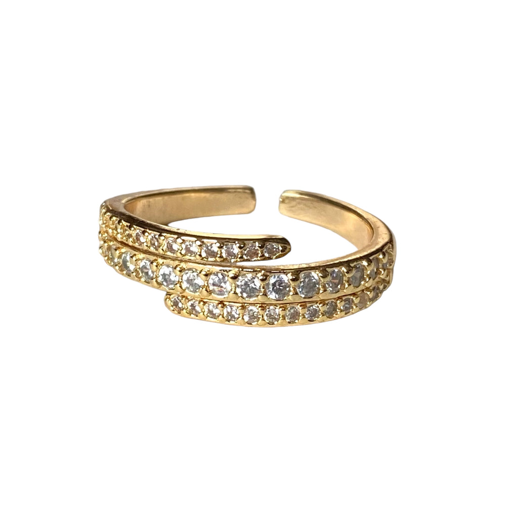 Rock out with Felicity, the edgy and adaptable Goldfilled ring with uneven stacked layers, studded with CZ stones, and adjustable size. As seen on Jenn Tran from TV's The Bachelorette, this ring adds a touch of rebellious style to any outfit. Adjustable starting at size 6.