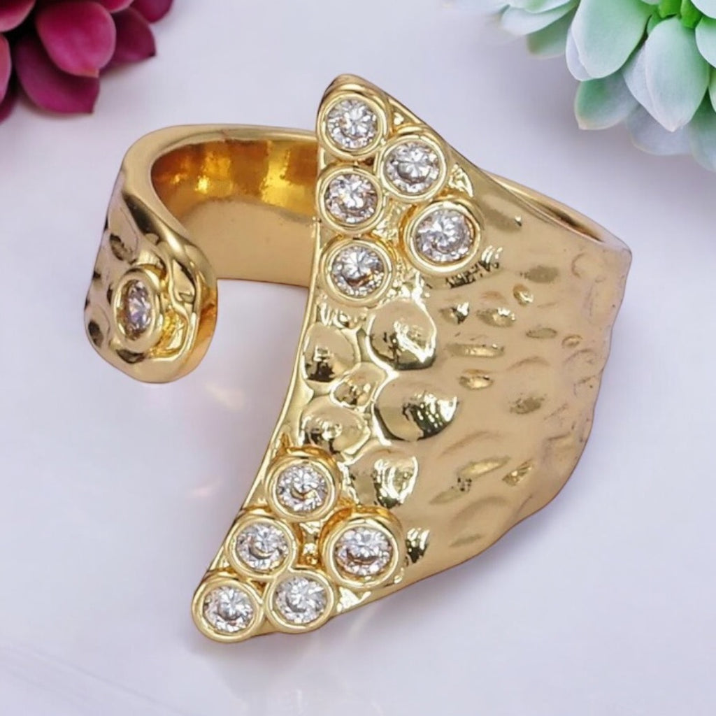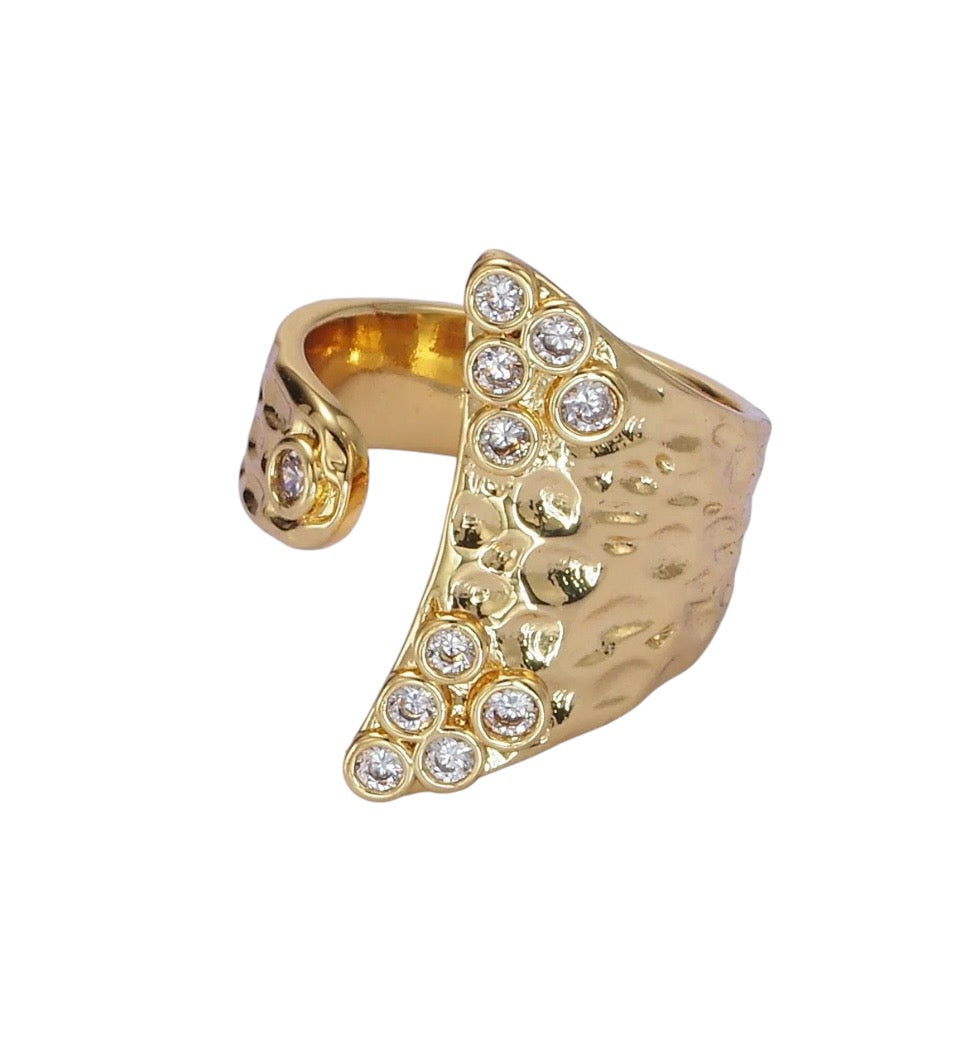 Joan: the statement ring for those who love to make a splash! Featuring a large abstract hammered fish tail design wrapped around your finger, this ring is adjustable and adorned with round cut CZ cubic zirconia for a touch of glamour. Made with 14K gold fill for lasting shine. Featured on Jenn Tran on the Finale of the Bachelorette!