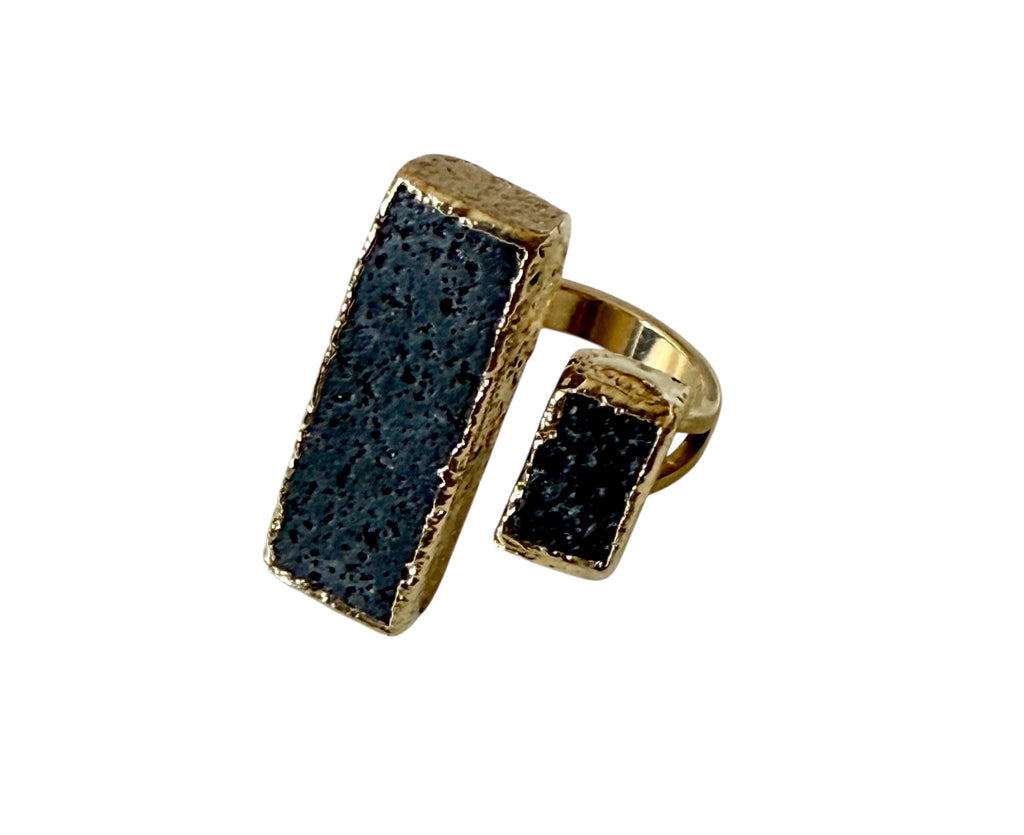 Fire that refuses to die: Make a bold statement with the Cinder ring, featuring a double asymmetrical design crafted from striking lava stones. Its open shank wraps effortlessly around your finger, balancing a small ½-inch stone with a longer 1-inch counterpart for an edgy, unconventional look. Perfect for those who dare to stand out.