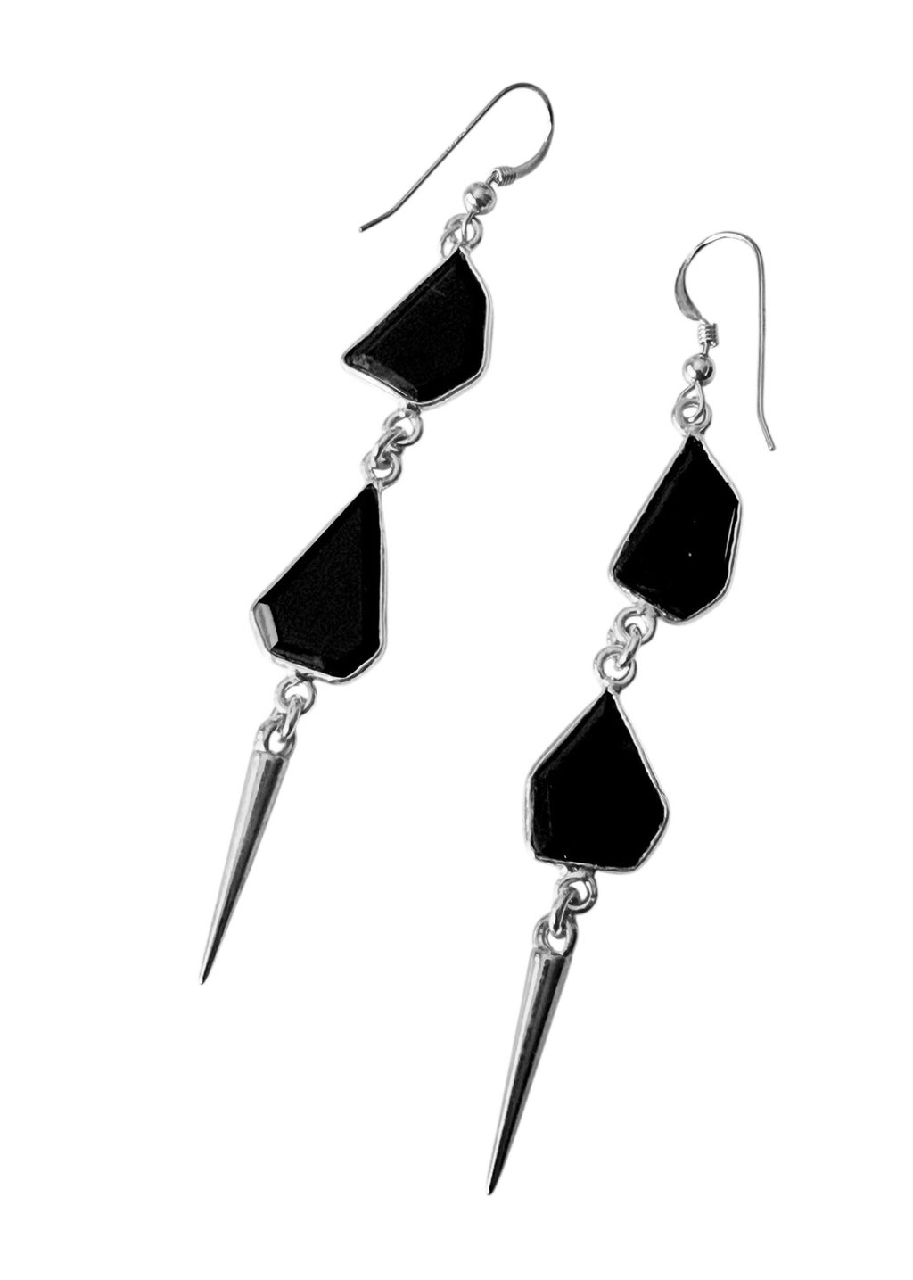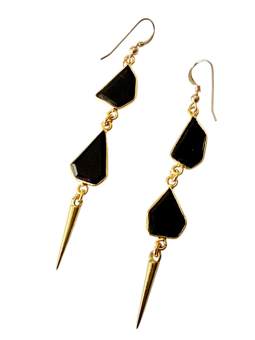 The silent watcher, always protecting: Stand out boldly with the Sentinel earrings, featuring twin organic onyx stones stacked along a sleek 2-inch frame, finished with a sharp spike accent. These striking earrings blend natural depth with an edgy twist, perfect for making a fearless style statement.