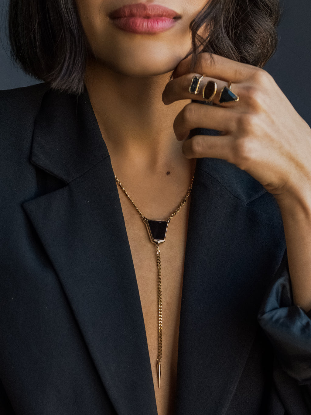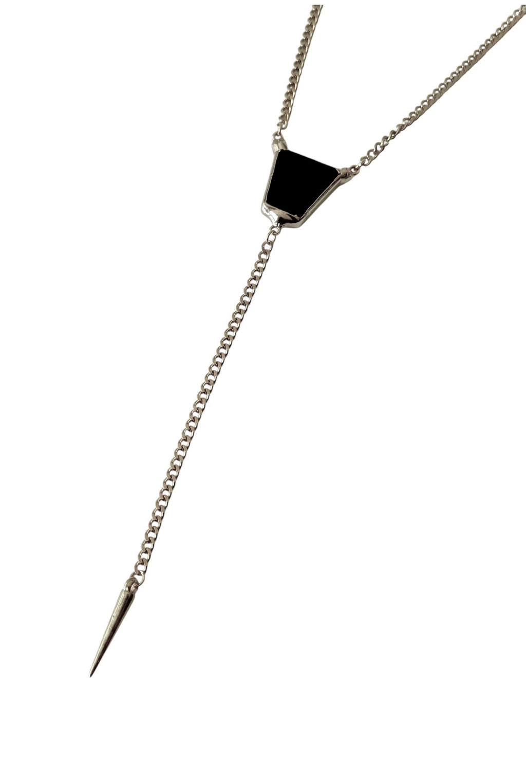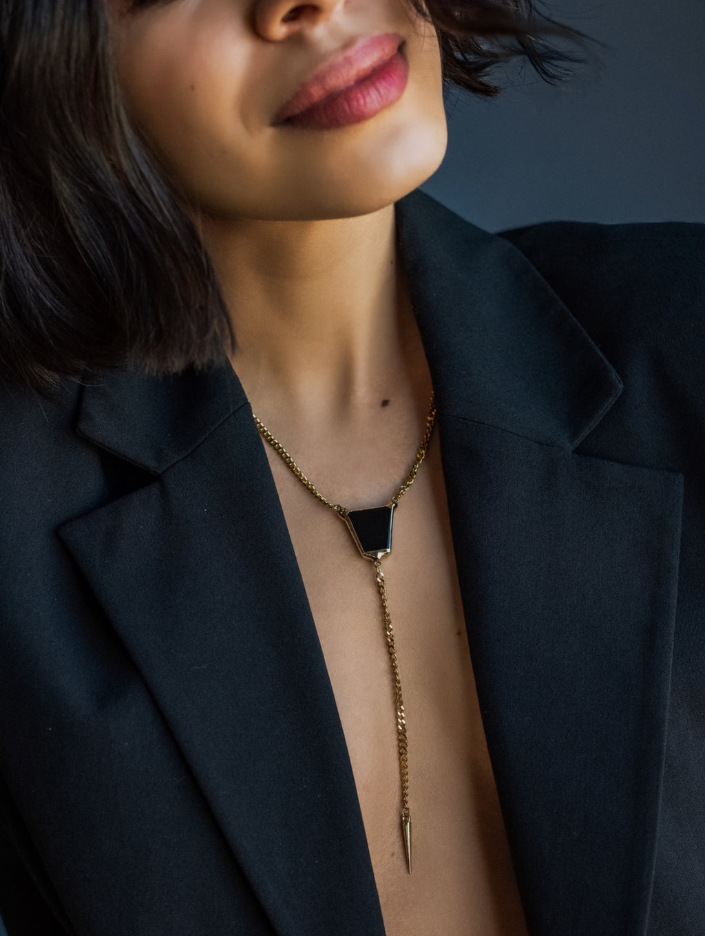 Protects what’s sacred; the hidden is holy: The Veil necklace commands attention with a daring design featuring a striking onyx center stone. Its sleek lariat style ends with a bold spike, adding an edgy finish to the 4-inch bottom chain. Customize your fit by choosing your preferred neck length—the bottom chain matches it perfectly for a balanced, captivating look. Elevate your style with this provocative statement piece that moves seamlessly from day to night.