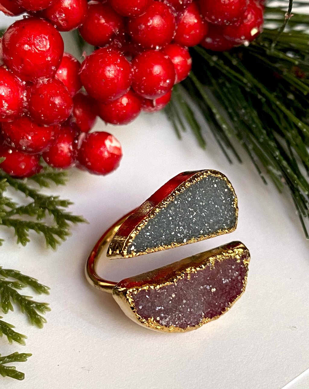 This beautiful ring is crafted from a unique blend of pink and dark blue druzy stones, set on an adjustable gold plated band. This stunning piece makes an eye-catching addition to any jewelry wardrobe, catching the light with its unique color and texture.