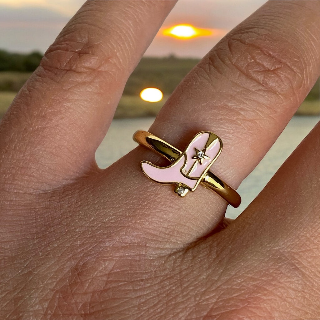 Expertly crafted with goldfield materials, this light pink cowboy boot adjustable ring adds a touch of western charm to any outfit. Made to fit any finger size, it provides effortless style and versatility for all occasions. A must-have for any fashion-forward individual.