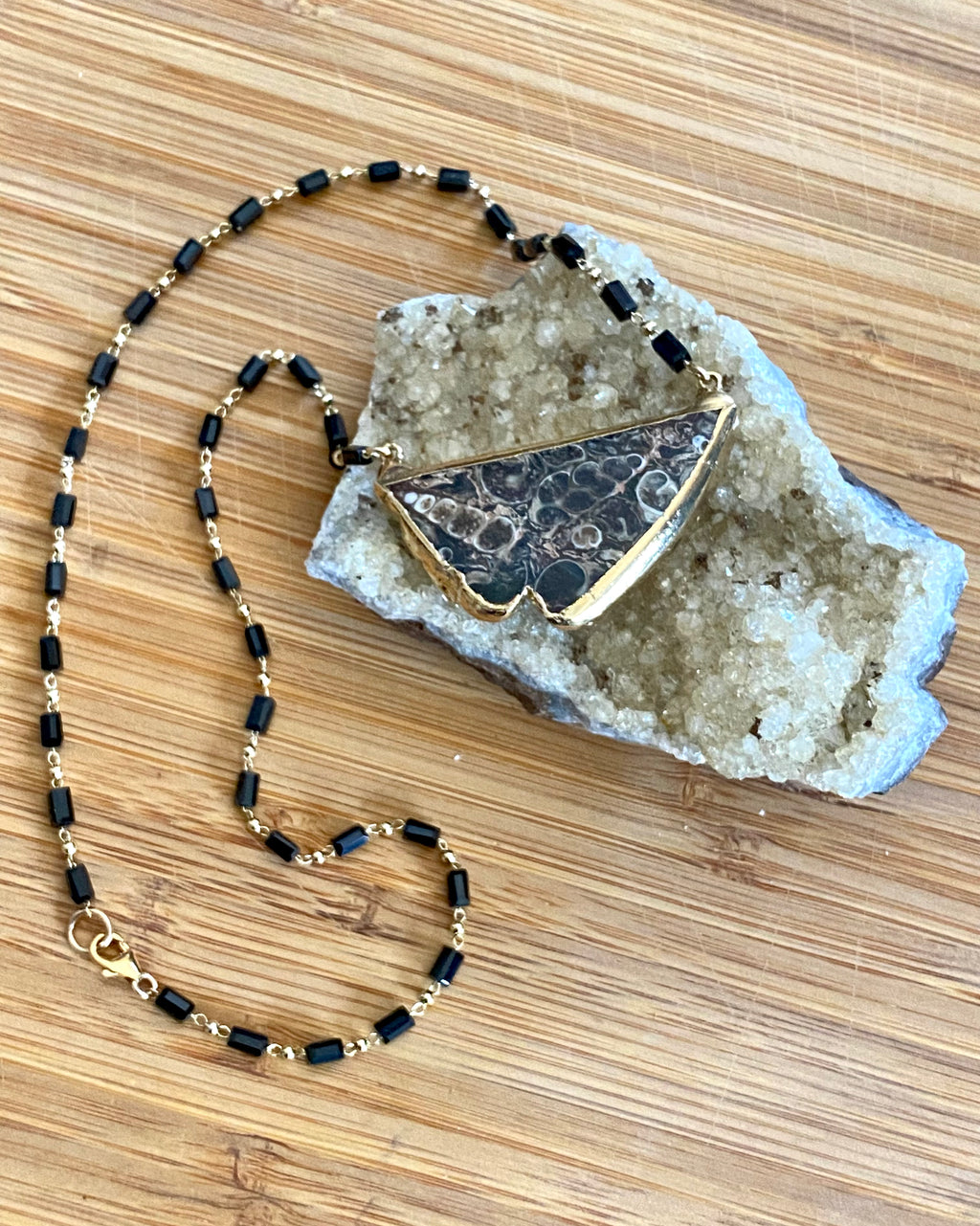 This Spotted Jasper on black chain necklace is a beautiful accessory that will make a statement. The hand carved 1.75 inch spotted jasper pendant is accented with a beaded black chain that measures 18 inches in length. This one-of-a-kind piece will add a unique and eye-catching look to any ensemble.