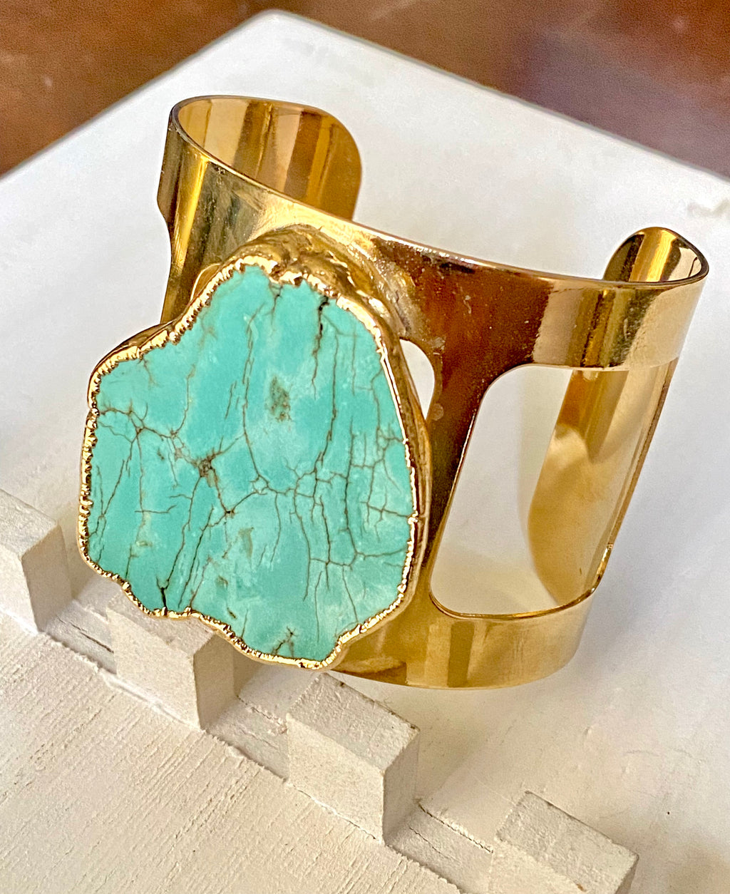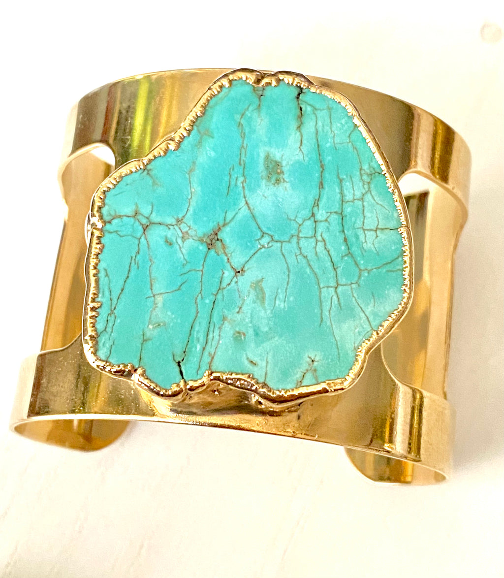 This organic shaped Turquoise cuff bracelet fits wrists of 7-7.5 inches and has a width of 1.5 inches. It stands out with its cut out metal sections that add flair to any outfit. Perfect for everyday wear, this bracelet can be styled for both casual and formal occasions.