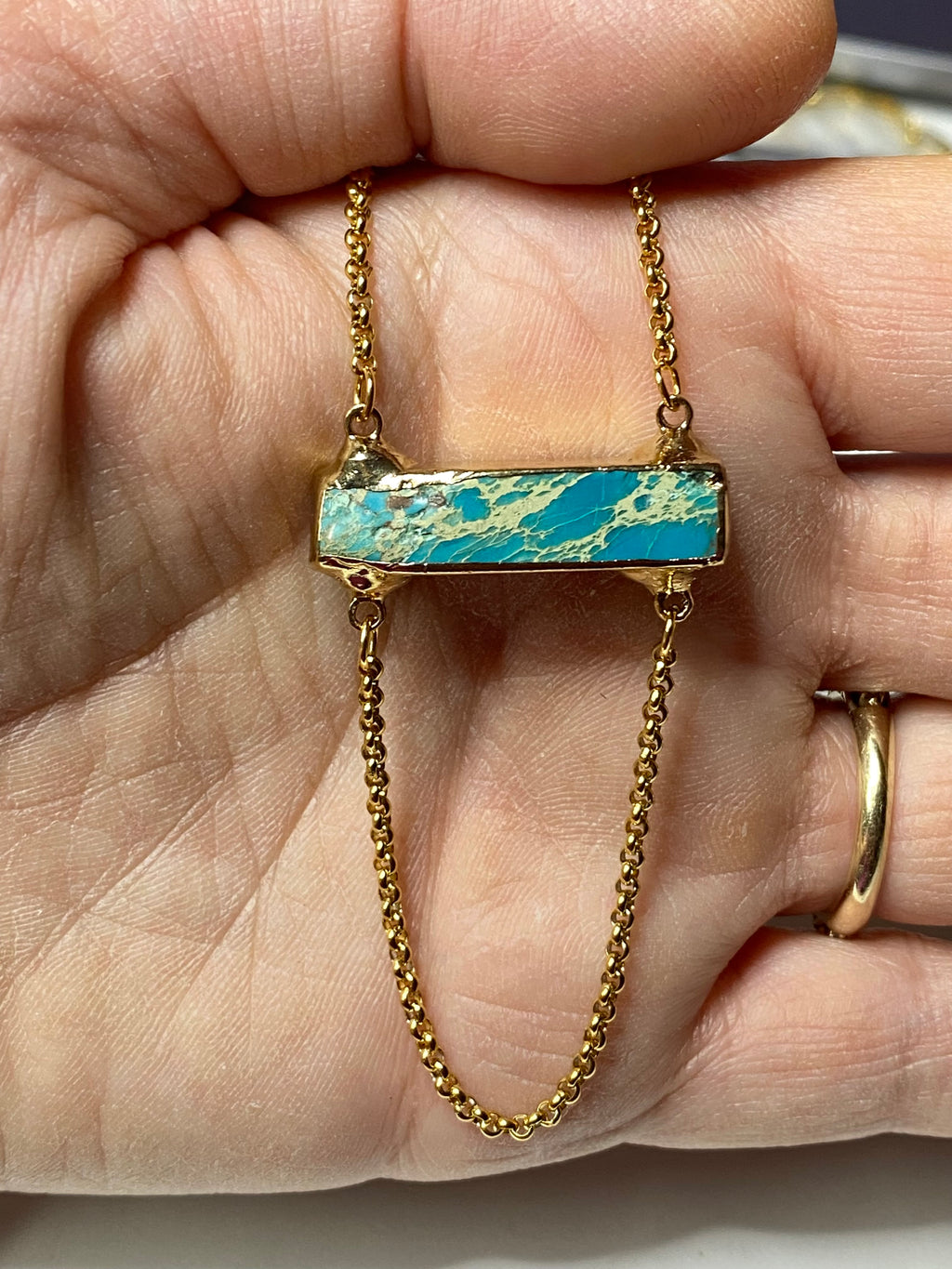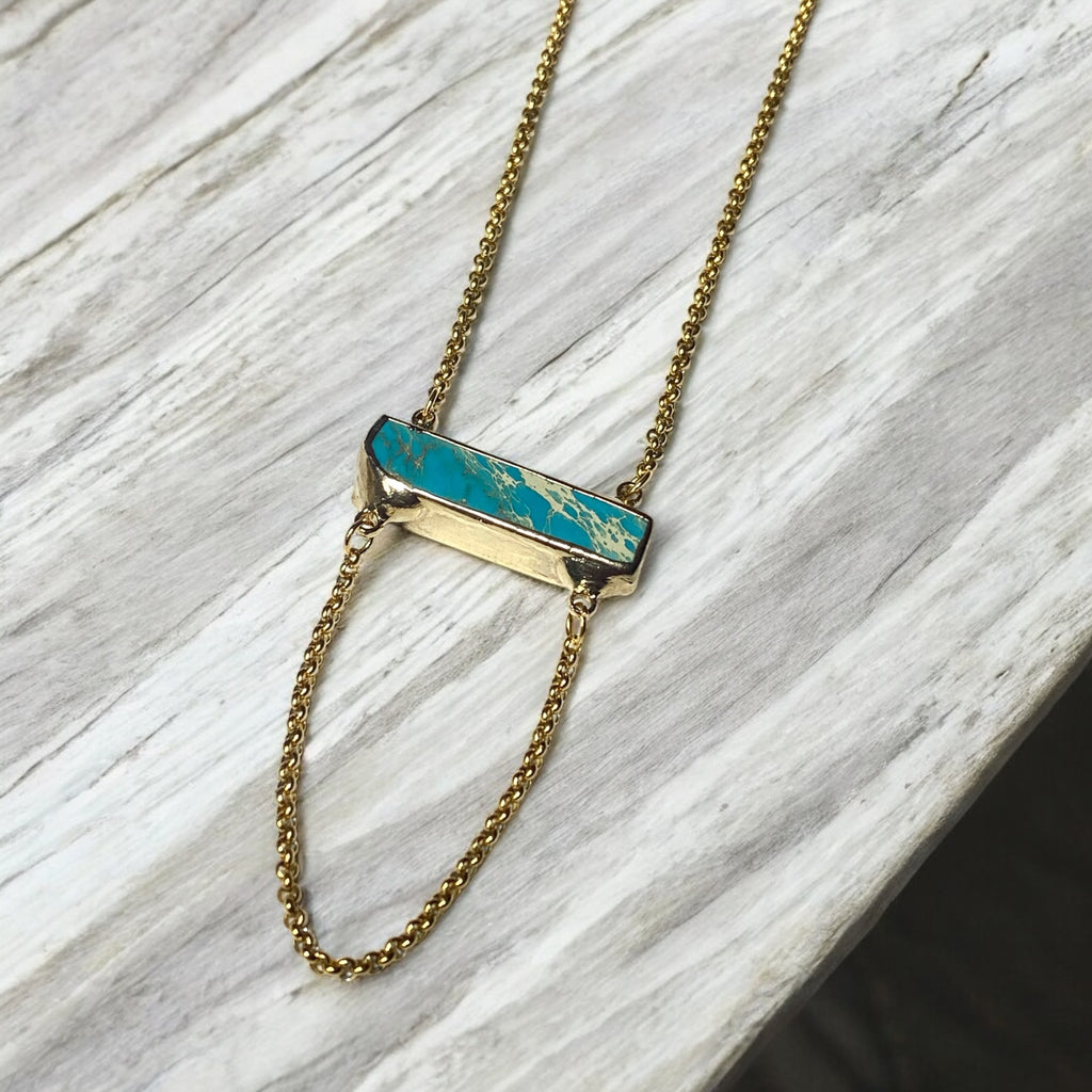 Add a pop of color to your outfit with our Turquoise pendant necklace. Featuring a stunning turquoise pendant on an 18 inch chain with 2 inch bottom looped chain, this necklace is the perfect accessory for any occasion. (Plus, it'll make all your friends green with envy! Shh don't tell them where you got it!)