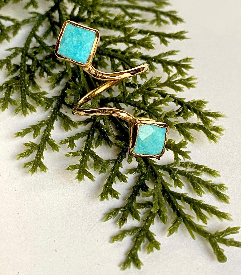 This elegant snake wrap ring adjustable is crafted with two turquoise stones on a delicate, hammered wire band. The adjustable closure guarantees a comfortable fit. This timeless piece adds a pop of color and adds style to any outfit.