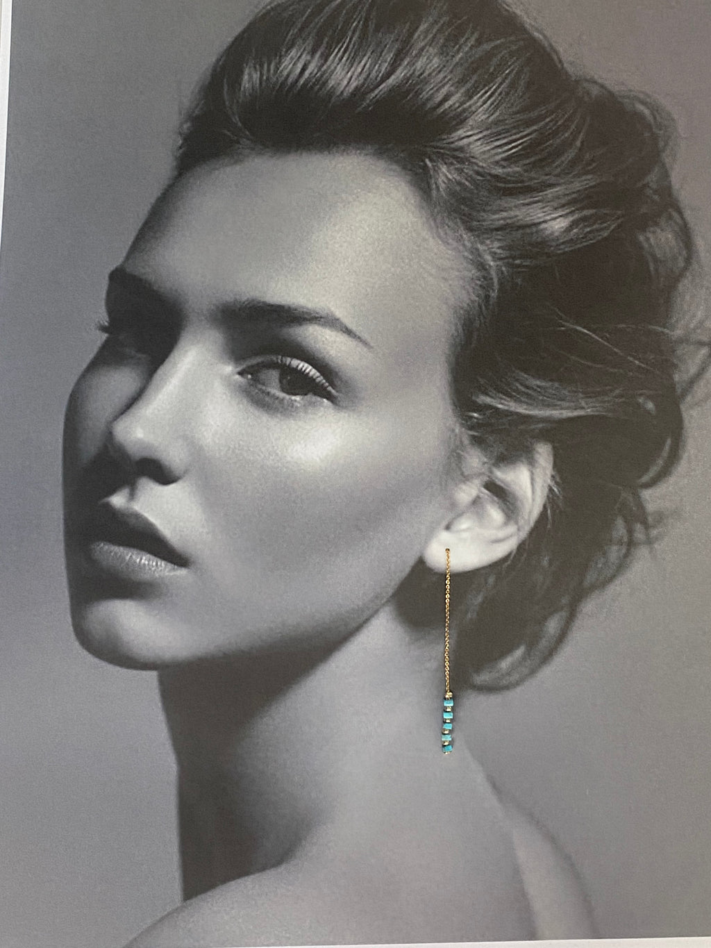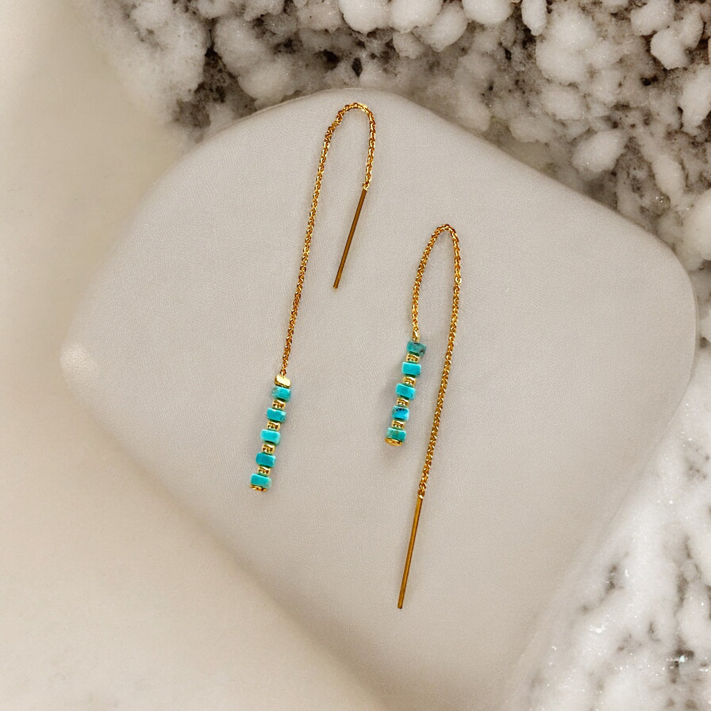 Discover the perfect blend of fun and elegance with our Turquoise threader earrings. Made with lightweight, gold filled chain and accented with small turquoise stones, these earrings can be threaded through one or double piercings for a versatile look. Add a unique touch to any outfit and elevate your style.
