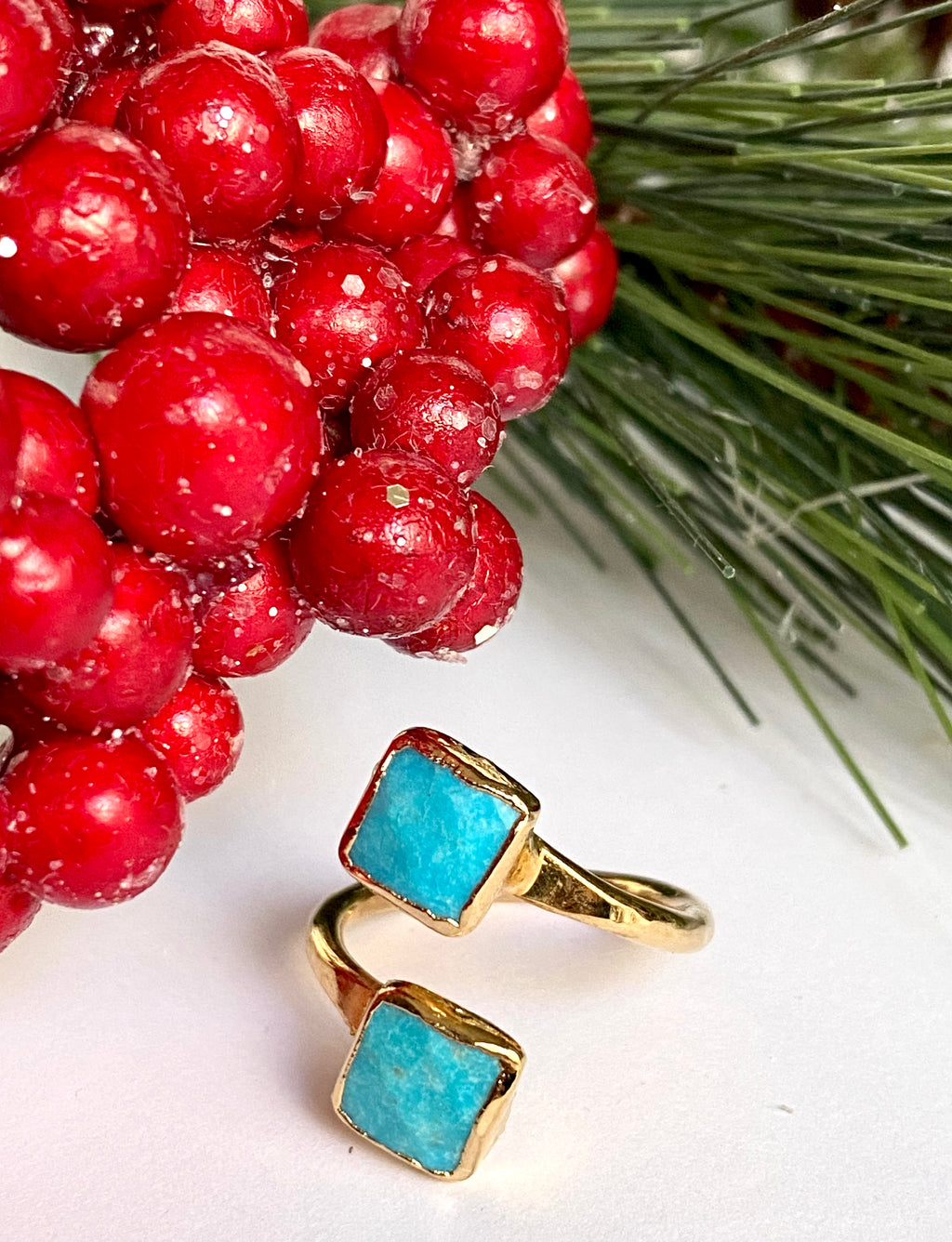 This Sleeping Beauty Turquoise wrap ring features a double diamond shaped turquoise stone set in a slightly adjustable, wrapped ring band. Its unique design makes this piece an eye-catching accessory for any occasion.