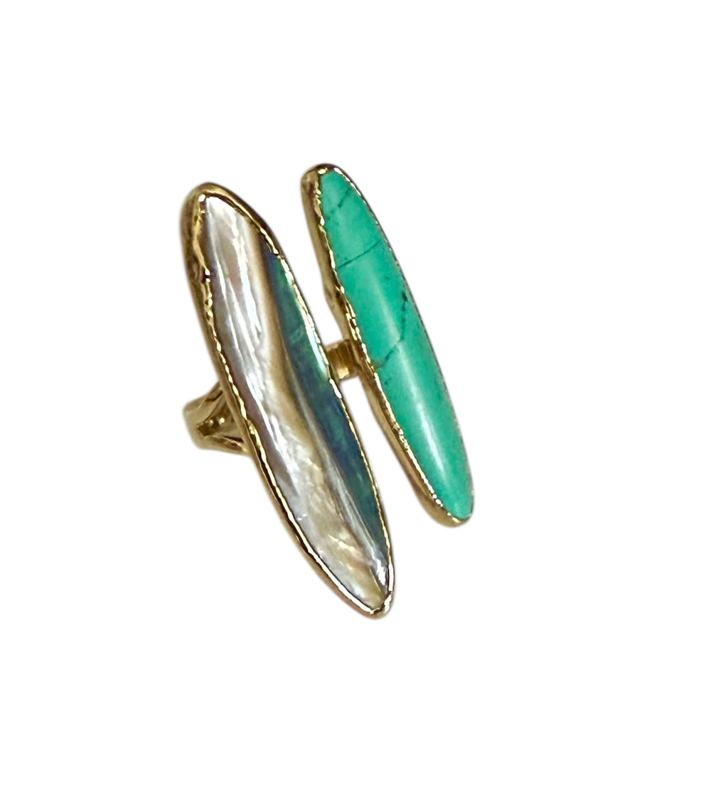Introducing Joey, our one-of-a-kind mother of pearl stone ring with adjustable turquoise stones (approximately 1 inch each). As seen on Taylor Frankie Paul, the new Bachelorette on ABC's The Bachelorette. Get your own piece of unique and stylish jewelry for any occasion!