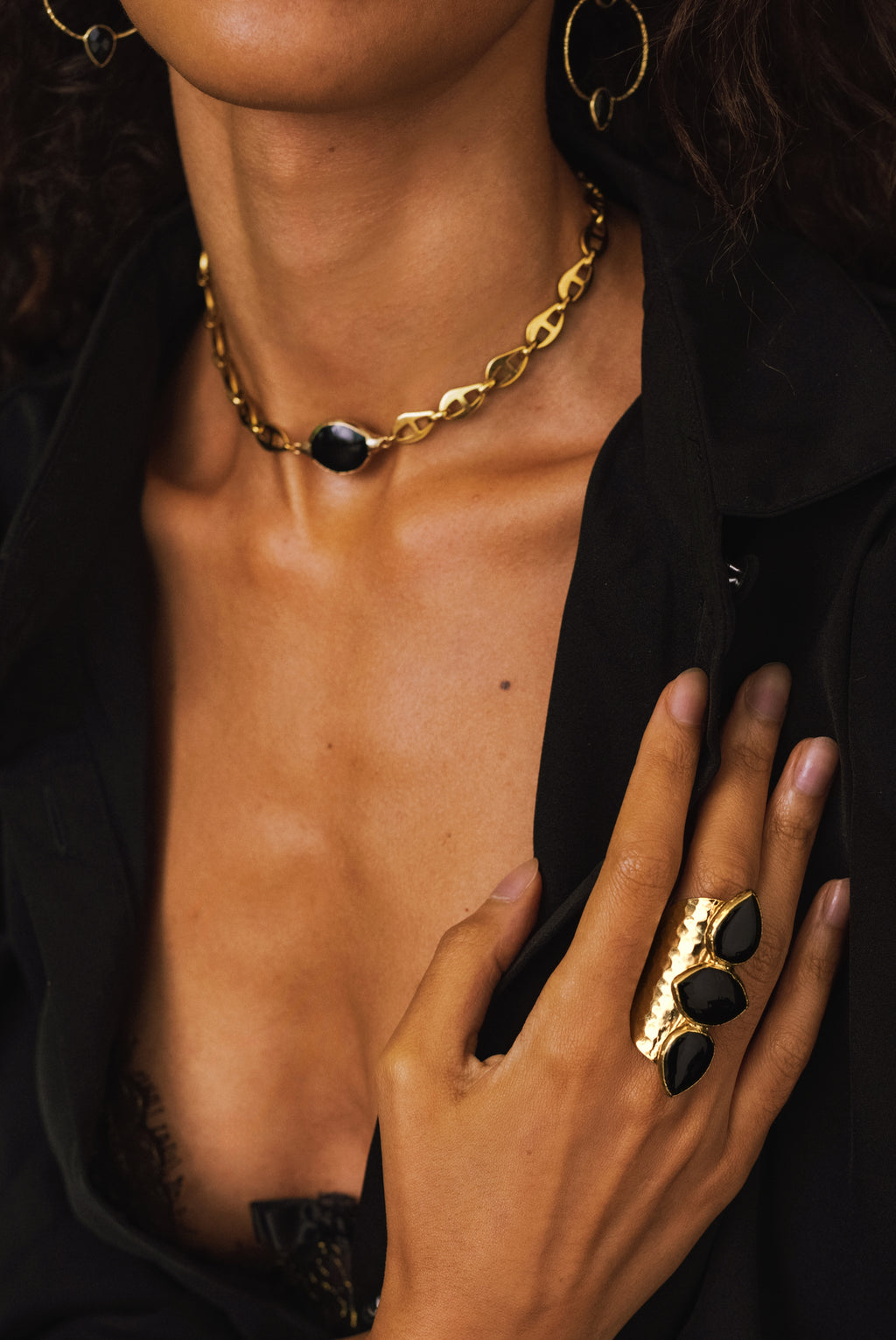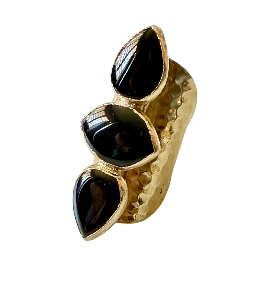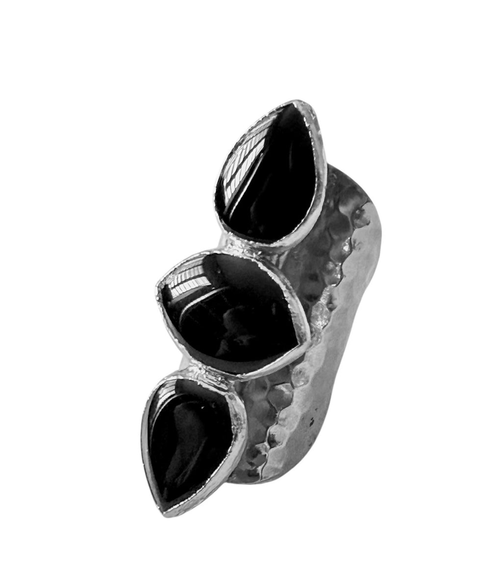 Feminine force wrapped in elegance: The Nightshade ring features three bold onyx stones set on a rugged hammered cigar band, measuring 1 3/4 inches long. Its slightly adjustable design offers a confident fit, perfect for those who want to make a daring statement.