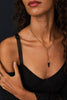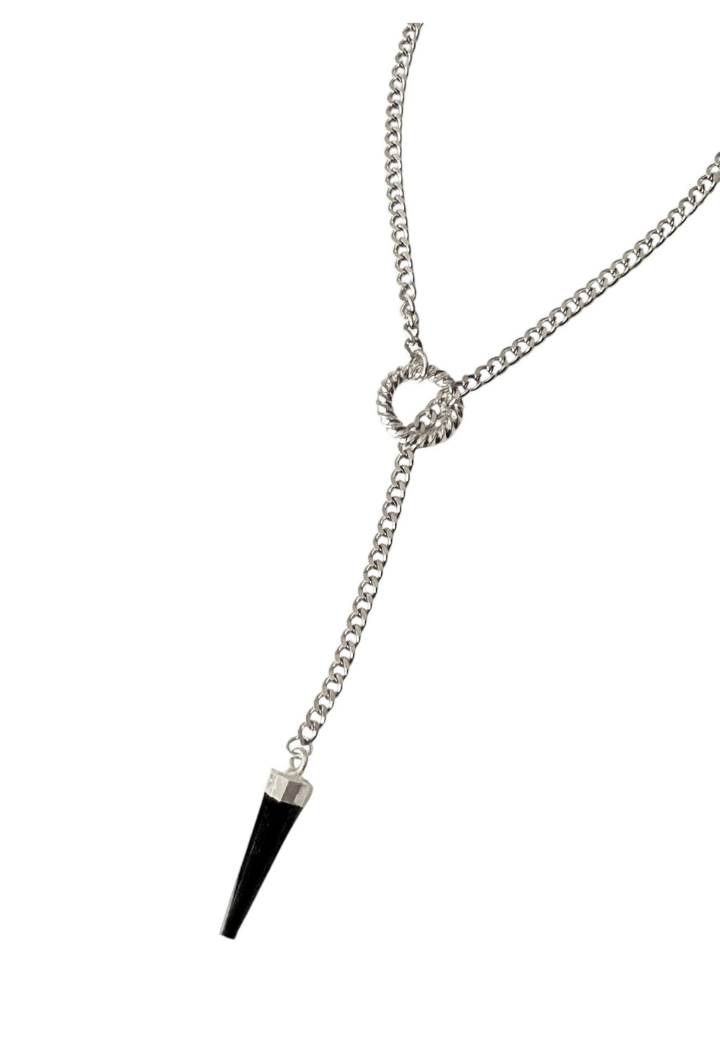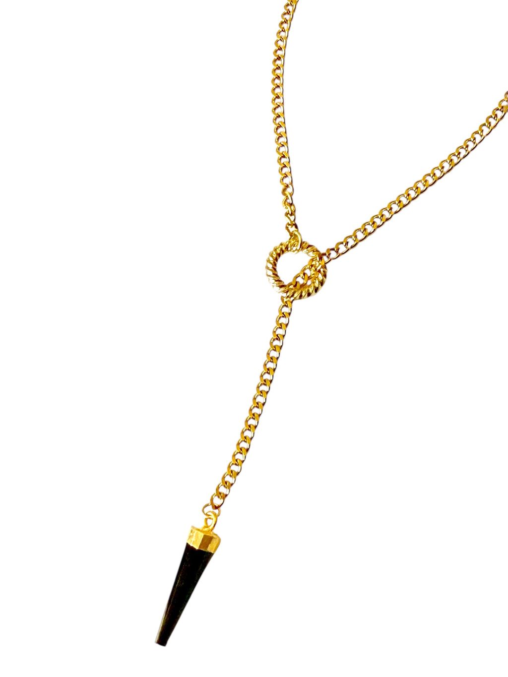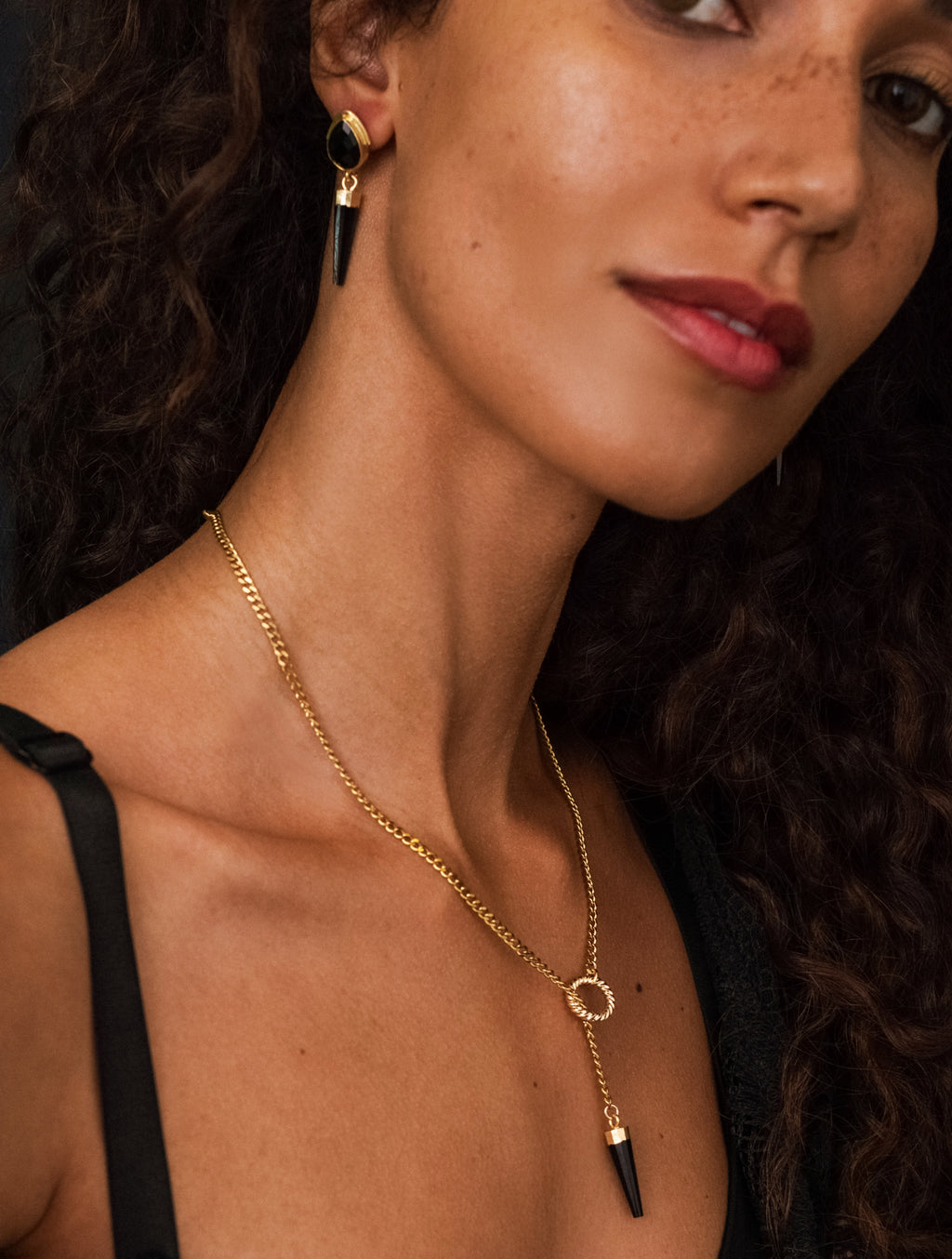 A sign, a warning, or a blessing depending on who you are:  The Omen necklace features a striking onyx spear pendant designed to make a bold statement. Its unique lariat style lets you effortlessly thread the stone through the round toggle, blending edgy sophistication with easy wearability. This daring piece elevates any outfit with a touch of dark elegance and modern versatility.
