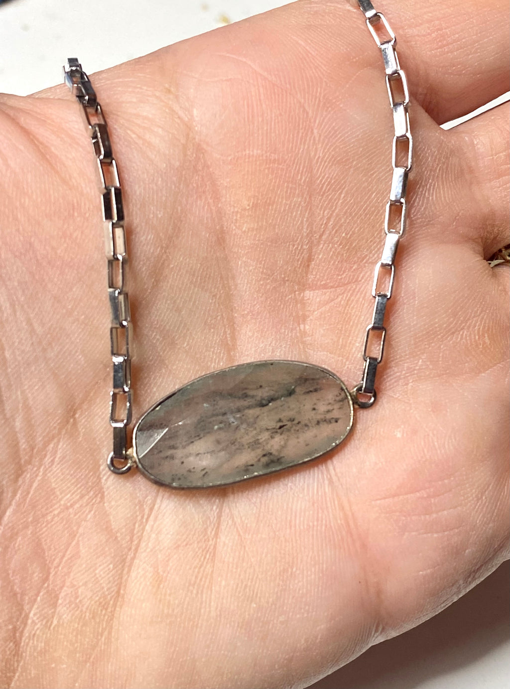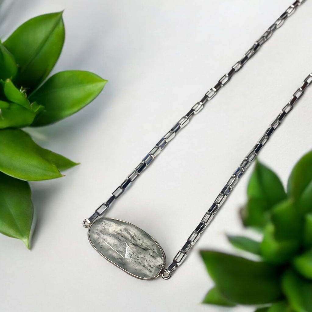 Add a touch of whimsy to your style with this playful Rutilated Quartz pendant necklace! Its oval shape and silver box chain make it a unique and versatile accessory for any outfit. Let the rutilated quartz stone bring you joy and positivity throughout the day. Pendant is 1 inch long.