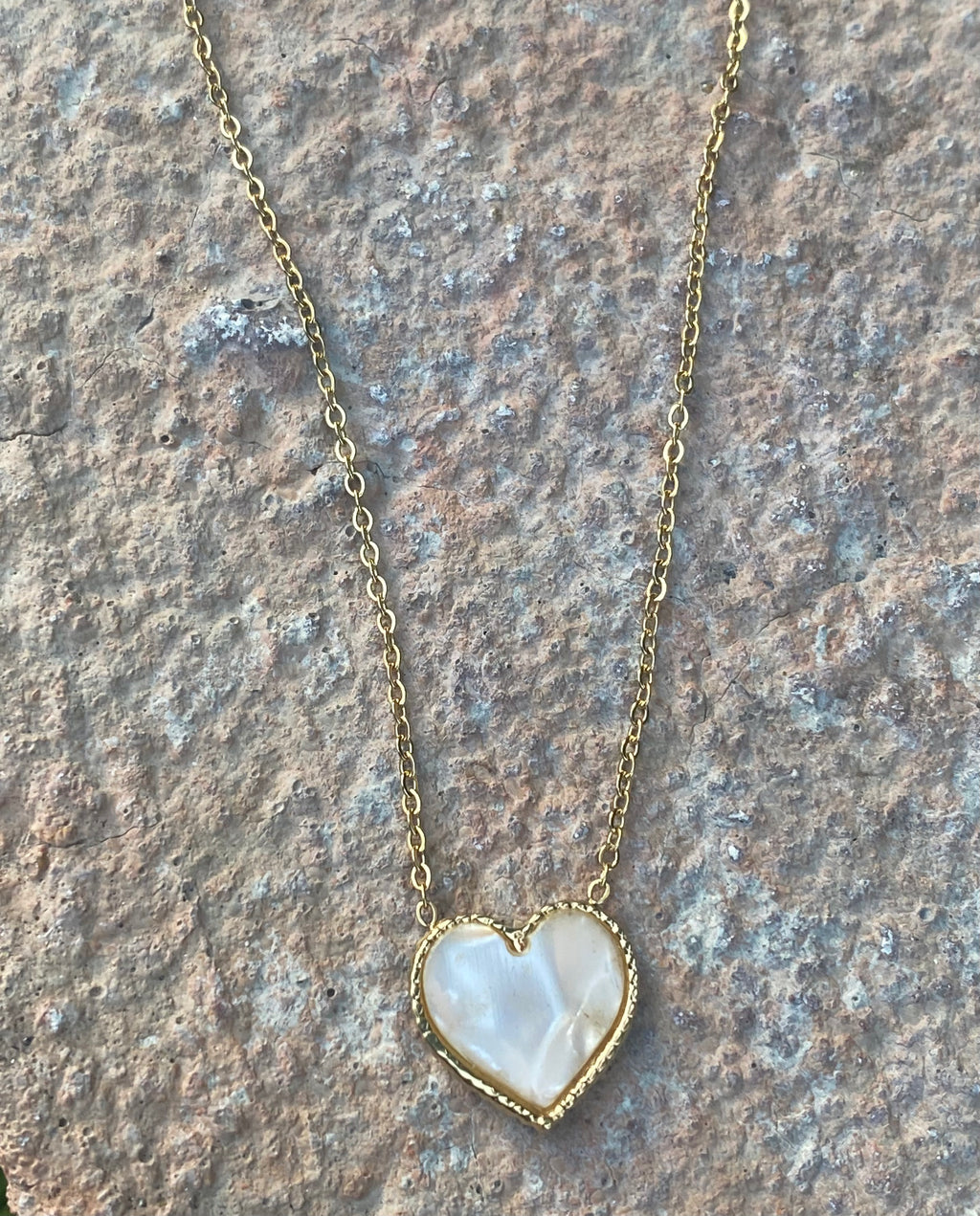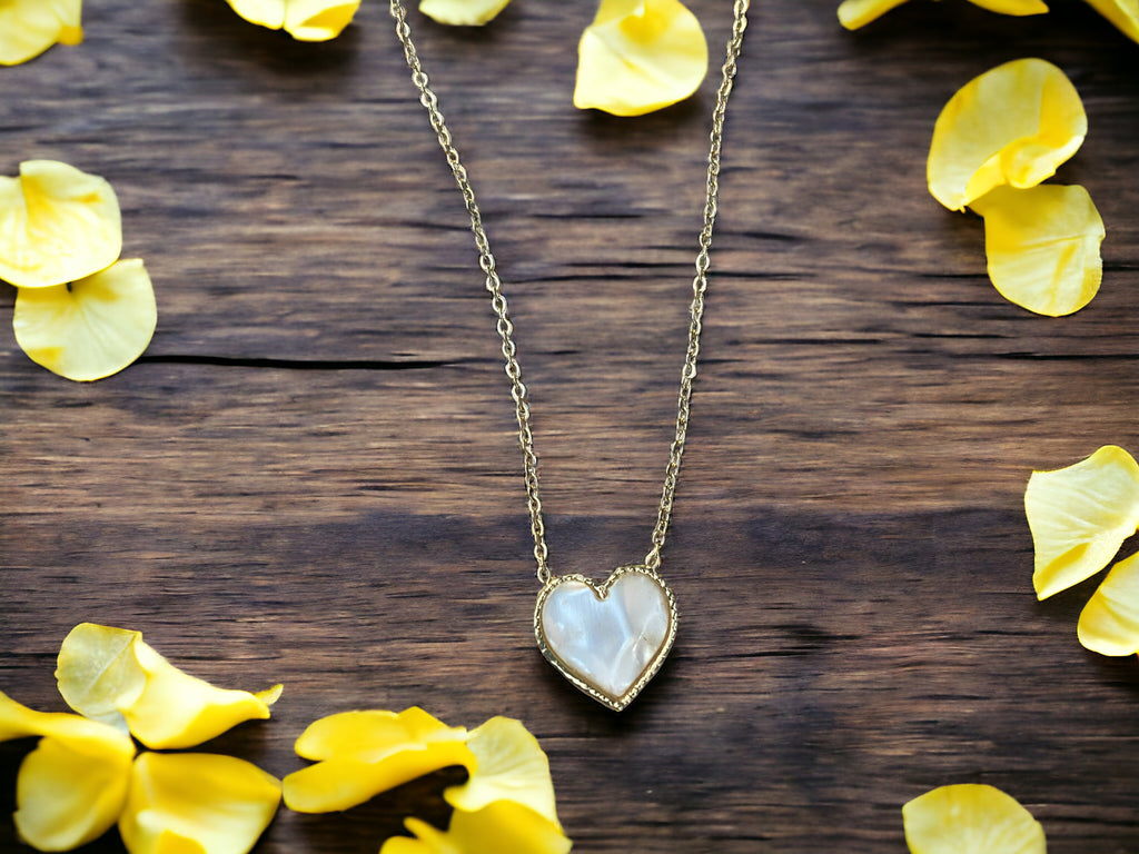 This elegant necklace features a 1/2 inch mother of pearl heart pendant on an 18 inch gold filled chain. The delicate design exudes a sense of sophistication and charm, making it the perfect accessory for both casual and formal occasions. The mother of pearl signifies purity and protection, making it a meaningful gift for any loved one.